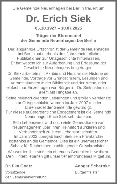 Autor: Siegfried Wagner war Redakteur des Neuenhagener Echos und hat Dr. Erich Siek zuletzt im Jahr 2024 für ein Kurzportrait des langjährigen Ortschronisten getroffen