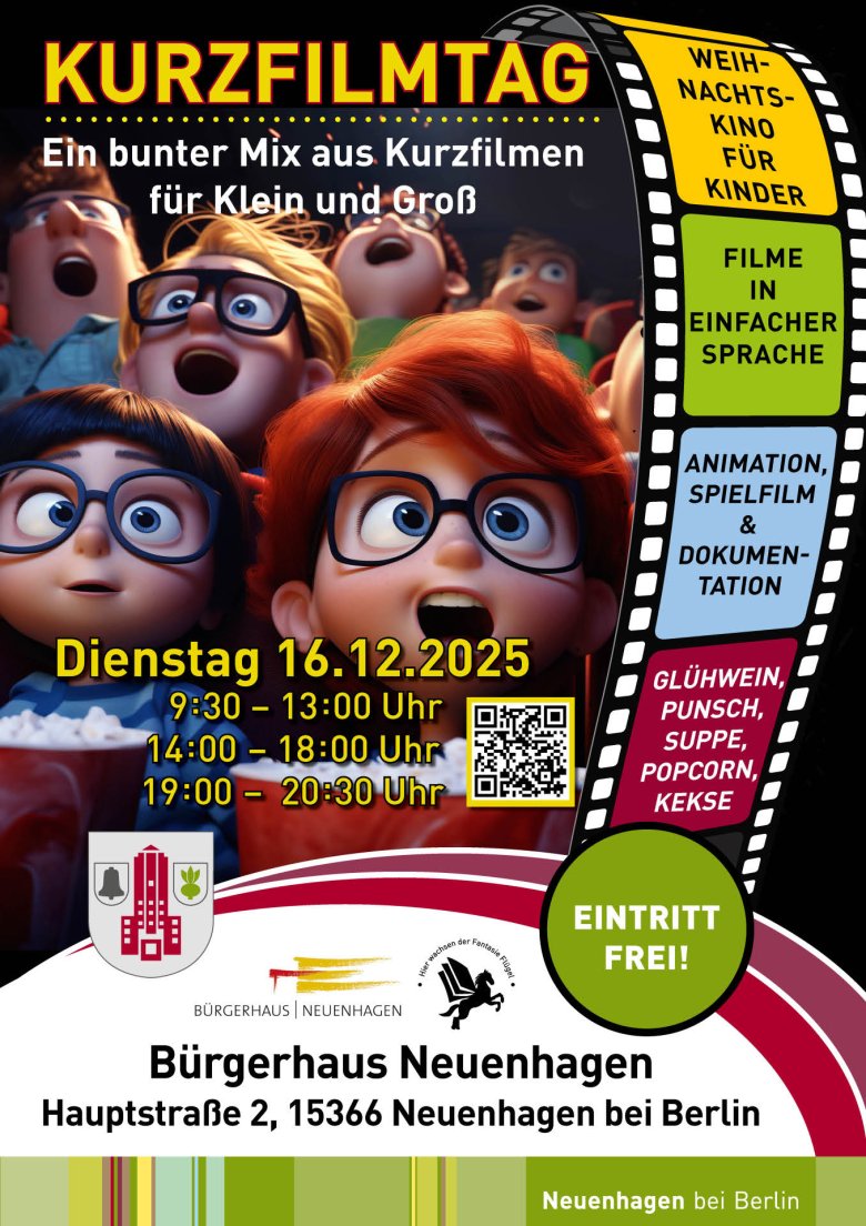 Für die Neuenhagener Premiere werden am 16. Dezember 2025 drei verschiedene Zielgruppen angesprochen. Gemeinsam mit der Anna-Ditzen-Bibliothek wird es einen bunten Mix aus Kurzfilmen geben. Los geht es mit dem Weihnachtskino für Kinder um 09:30 Uhr. Dann werden zwei fröhliche Kurzfilme gezeigt, die die Kinder in die winterliche Wunderwelt von Pettersson und Findus sowie Tomte Tummetott entführen. Weiter geht es mit kurzen Filmen im Foyer des Bürgerhauses in der Zeit von 14 bis 18 Uhr. Es werden acht kurze Filme zum Thema Urlaub, Streit und Abenteuer gezeigt. Den winterlichen Abschluss bildet „Auf ins Jetzt!“ von 19 bis 20:30 Uhr. In den Abendstunden ist ein bunter Mix aus Animations-, Spiel- und Dokumentarfilmen zu bestaunen. Dabei geht es mit Glühwein, Gulaschsuppe und Popcorn, entsprechend der Jahreszeit, gemütlich zu. „Es wird sicher ein toller Tag. Nicht zuletzt, weil das Filmangebot, also ohne Speisen und Getränke, kostenlos ist“, blickt Bibliotheksleiterin Stefanie Reich positiv auf den Neuenhagener Kurzfilmtag.