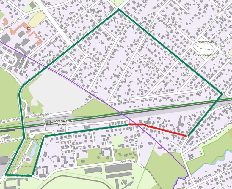 Aufgrund einer umfangreichen Instandsetzungsmaßnahme an der Fahrbahn in der Hoppegartener Straße erfolgt im o.g. Zeitraum eine Vollsperrung der gesamten Hoppegartener Straße. Die Umleitungsstrecke erfolgt ab Kreuzung Hoppegartener Straße über den Bahnübergang Niederheidenstraße in den Sankt-Georgs-Weg, die Rudolf-Breitscheid-Allee und im Gemeindegebiet Hoppegarten weiter über Lindenallee – Goetheallee – Poststraße und Am Güterbahnhof zur Hoppegartener Straße.