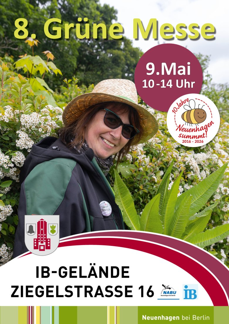 Mit der 8. Grünen Messe wird "10 Jahre Neuenhagen summt!" gefeiert. Dazu gibt es am 9. Mai auf dem Gelände des Internationalen Bundes in der Ziegelstraße 16 von 10 bis 14 Uhr ein buntes Angebot, rund um Natur und Garten. Korbhandwerk, handgefertigte Gartenkeramik, Wildblütengärtnerei – diese kleine Auswahl zeigt die Vielfalt der Messe. Die Nabu Naturschutzweiden gGmbH, das Naturschutzcamp Neuenhagen e.V., die RegioGruppe des Naturgarten e.V. und viele mehr, werden vor Ort sein, um die Veranstaltung zu beleben.