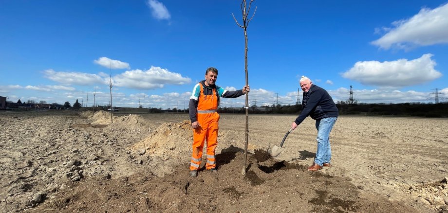Es geht voran bei der Parkanlage am Gruscheweg. Die als Kompensationsmaßnahme geplante Anlage zwischen Autobahn A10 und Gruscheweg erhält ihr begrenzendes Gesicht. Am 31. März wurden die ersten von 84 „Tilia cordata“, also Winterlinden, gepflanzt. Dies ist eine typische Baumart für Neuenhagen. Diese verträgt zeitweilige Trockenheit und lockt darüber hinaus beispielsweise Bienen, Vögel und Schmetterlinge an. Damit zahlt die Baumreihe auch auf das Projekt „Neuenhagen Summt!“ ein, das in diesem Jahr 10-jähriges Jubiläum feiert.