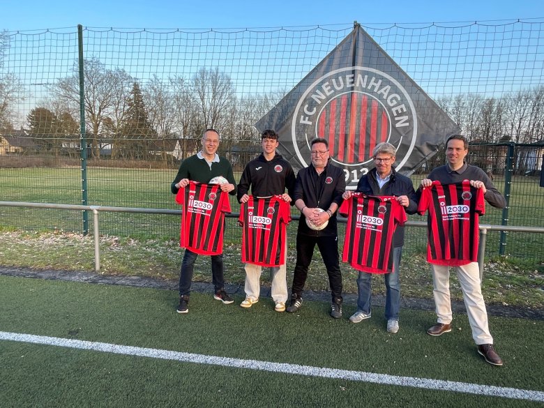 Bürgermeister Ansgar Scharnke setzt sich als i2030-Botschafter (www.i2030.de/botschafter-in) für den besseren Takt bei der S-Bahn ein. Täglich nutzen zahlreiche Pendler*innen die S-Bahnverbindung, um zu ihrem Arbeits- oder Ausbildungsplatz zu kommen. Die Gemeinde erhofft sich durch den Ausbau den Nahverkehr weiter zu stärken und damit den Straßenverkehr zu entlasten. „Wenn die Taktverdichtung kommt, freuen wir uns natürlich für alle Neuenhagener, die dann noch schneller reisen können. Wir müssen jedoch auch den innerörtlichen Verkehr mitdenken und etwa durch Schienenunterführungen lange Schrankenstandzeiten verhindern. Nur so stärken wir die ganzheitliche Akzeptanz solcher Infrastrukturprojekte. Die Trikots der Fußballer helfen dabei und machen das i2030-Projekt und die damit verbundenen Herausforderungen noch bekannter“, ergänzt Bürgermeister Ansgar Scharnke.