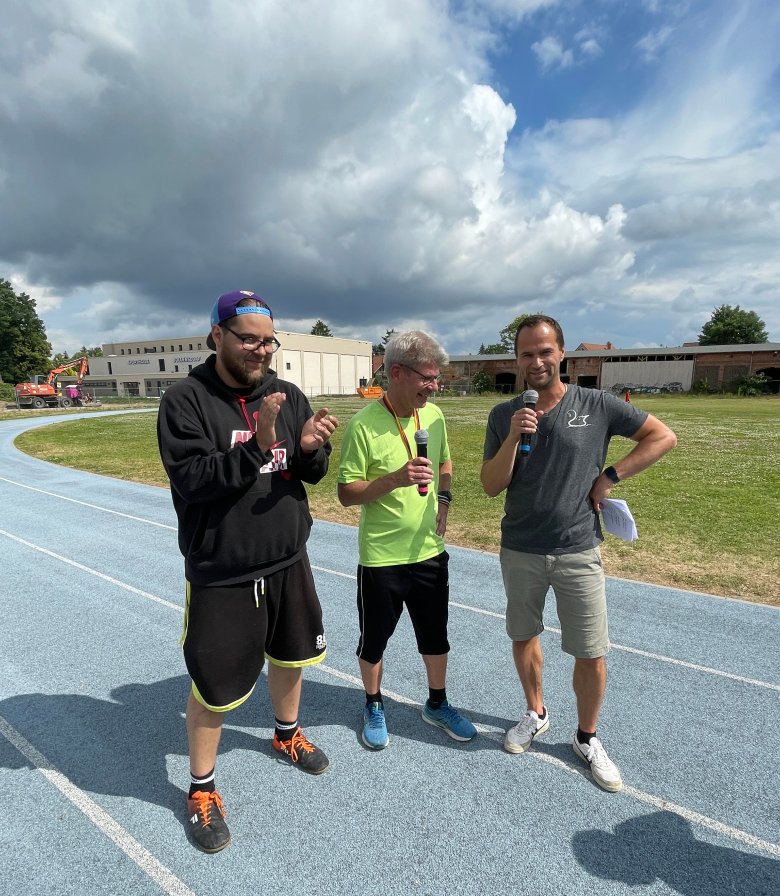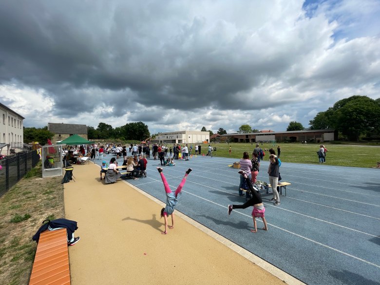 Beste Stimmung im Sport- und Geschichtspark Bollensdorf an einem Freitagnachmittag Mitte Juni. Die Verantwortlichen und der Förderverein des Hauses der Begegnungen Bollensdorf hatten zum Sponsorenlauf geladen, um für die Horteinrichtung Geld zu sammeln. Mehr als 80 Läufer gingen an den Start und drehten auf historischem Terrain ihre Runden, um pro Runde einen vorher ausgehandelten Betrag zu spenden. Die Aktion war ein vollen Erfolg, berichtet Hortleiterin Heike Urban: „Der Förderverein hat insgesamt 1650 Euro eingenommen. Die Kinder haben sich neue Fahrzeuge gewünscht, die nun angeschafft werden können.“ Neben den vielen Kindern aus dem Hort und der Kita „Wilhelm Busch“ haben sich auch mehrere Erzieher an den Start begeben. Das Rathaus schickte die Führungsspitze: Neben Bürgermeister Ansgar Scharnke war auch die stellvertretende Bürgermeisterin, Christiane Fälker, an den Start gegangen, um für den guten Zweck zu laufen. „Toll, was hier alles auf die Beine gestellt wurde, um für die Kinder Geld zu sammeln. Da sind wir gerne dabei, auch wenn es anstrengend ist“, sagte Scharnke am Rande der Veranstaltung. Für eine fröhliche Atmosphäre sorgten Popcorn, Eis, ein Grillstand und Getränke. Auch für Unterhaltung war gesorgt: Philipp Schmidt vom Jugendhaus Blaupause und Schwanenteich-Grundschullehrer Gregor Schumann spielten sich bei ihren kurzweiligen Moderationen gekonnt die Bälle zu, etwa beim Interview mit dem Bürgermeister.
