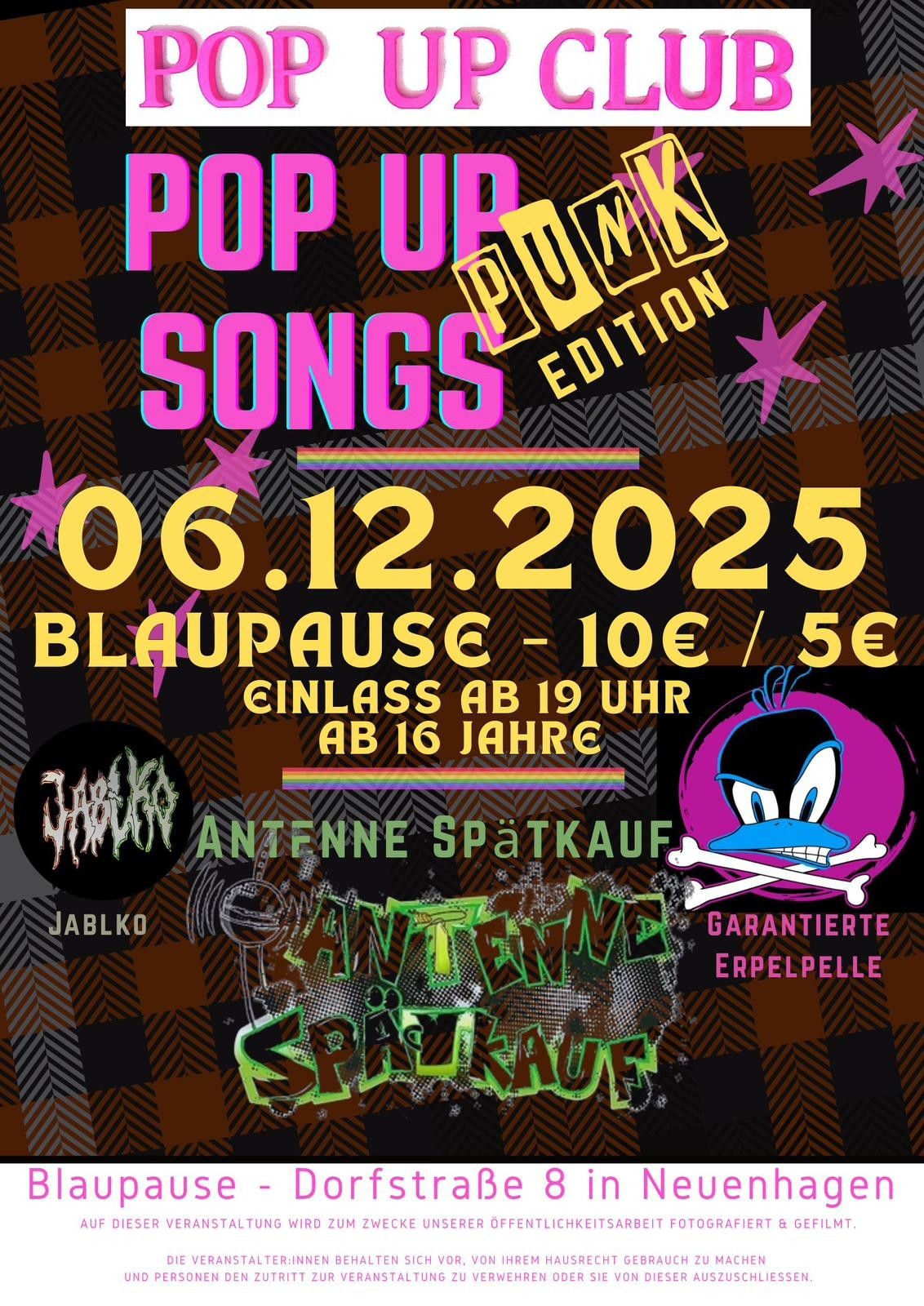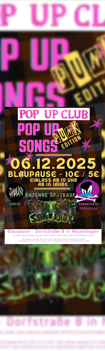 Im Dezember wagt der Pop Up Club Neuenhagen ein kleines Experiment: Passt Punk in das Stadtbild von Neuenhagen?! Für uns kann es nicht bunt genug sein - warum also nicht! Wir sind fest davon überzeugt, dass Neuenhagen das hinbekommt und freuen uns darauf, euch unsere Pop Up Songs Punk Edition vorzustellen!