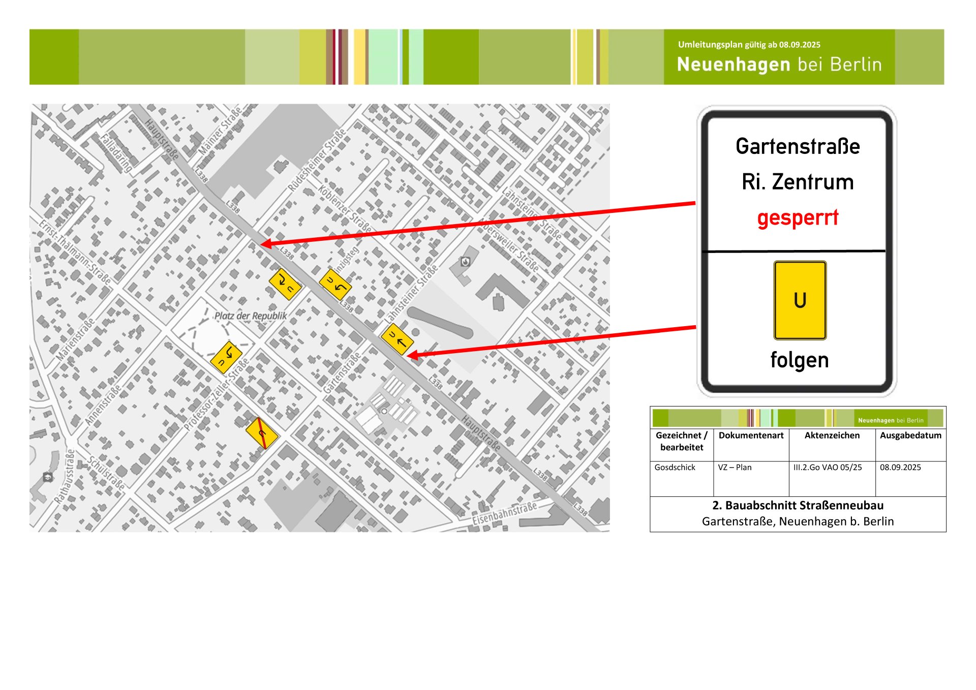 Über die Ernst-Thälmann-Straße und nach Freigabe des Kreuzungsbereiches Wolterstraße ist die Gartenstraße wieder erreichbar. Eine Umleitungs- und Hinweisbeschilderung ist aufgestellt.